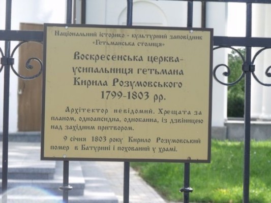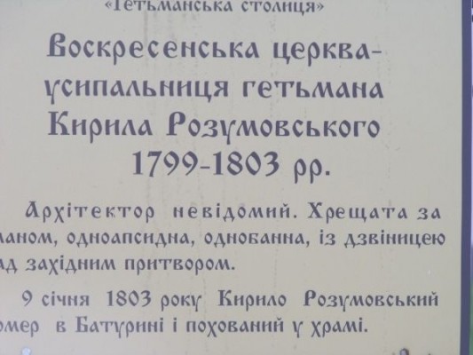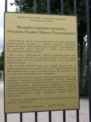 Але все з початку. Батурин побудовано на берегах річки Сейм. У добу Гетьманщини він ділився на 13 районів – невеличких хуторів. При в’їзді в це невеличке містечко можна побачити палацово-парковий ансамбль К.Г. Розумовського, що був останнім гетьманом України. Він у 1799 році розпочав будівництво, для цього запросив відомого архітектора Чарльза Камерона. Це була триповерхова будівля, що дійшла до наших днів. В той час він знаходився у прекрасному парку, але, на жаль, сам парк не зберігся. У 1803 році Кирило Розумовський помирає. Жоден з його нащадків так і не живе в Батурині.
