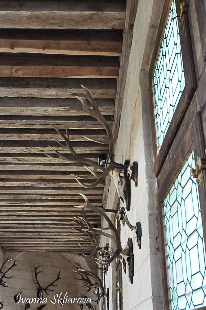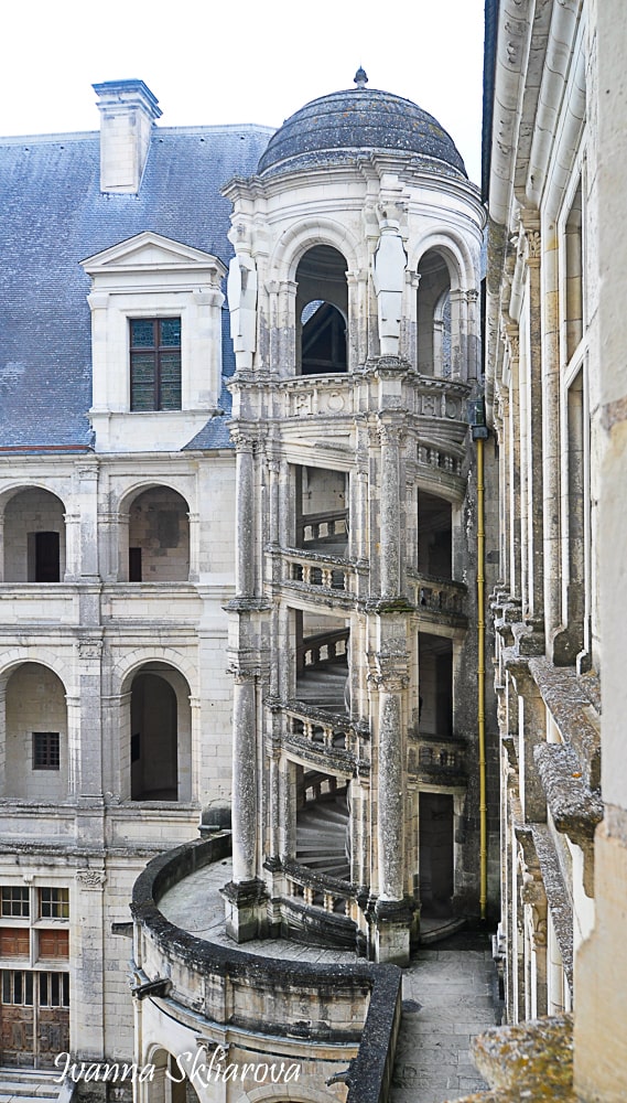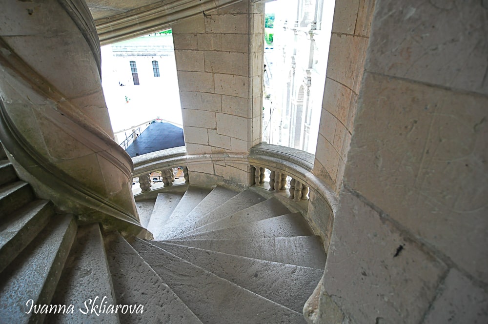 Вибір зупинили на сходах з подвійним гвинтом - цей варіант був набагато зручніший, оскільки з подібних сходів можна було б потрапити до будь-якої кімнати замку. Сходи були декоровані прикрасами німф, гарпій, химер, тут же можна побачити і множинне зображення герба короля - саламандру, що вивергає вогонь.