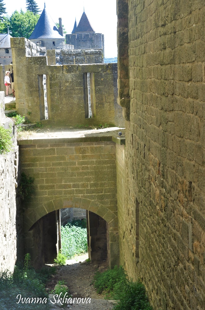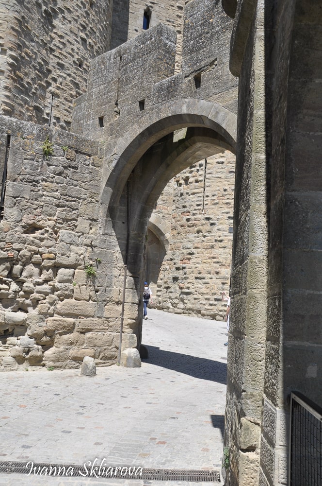 Окрім чотирьох головних воріт внутрішнього оборонного поясу - Нарбонських на сході, Од на заході, Сен-Назер на півдні і Родез на півночі, було багато потайних ходів з фортеці, які при необхідності без зусиль закладалися. Вони дозволяли воїнам гарнізону потрапляти від одного поясу оборони в інший непомітно для ворога.