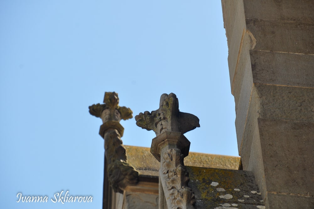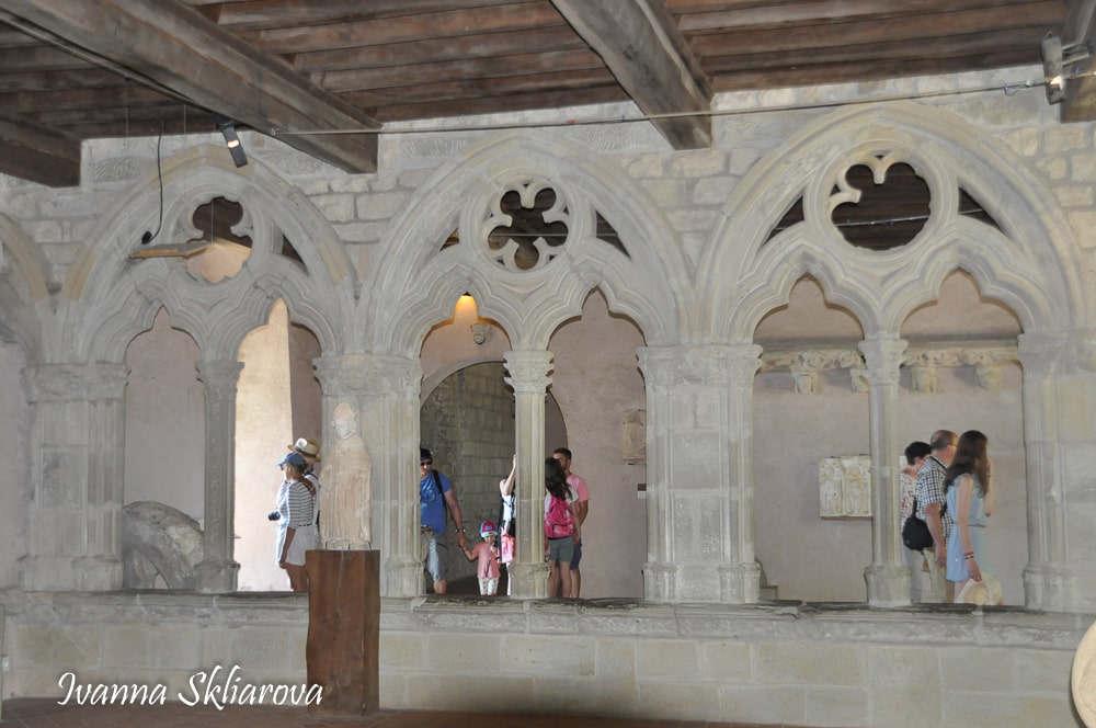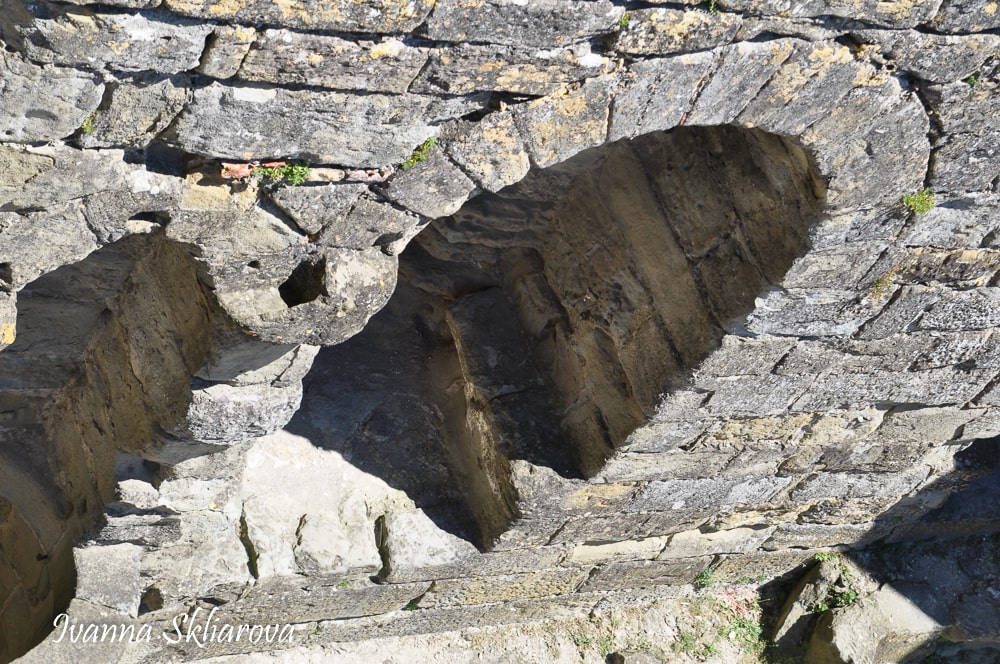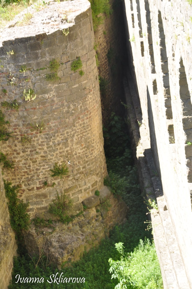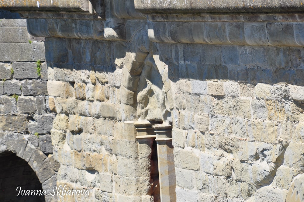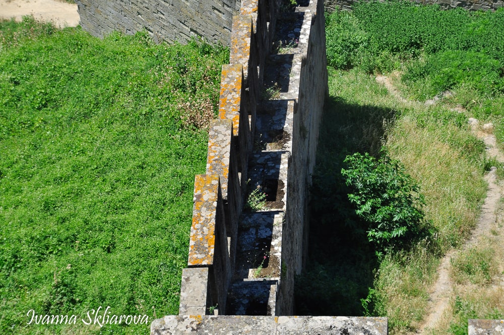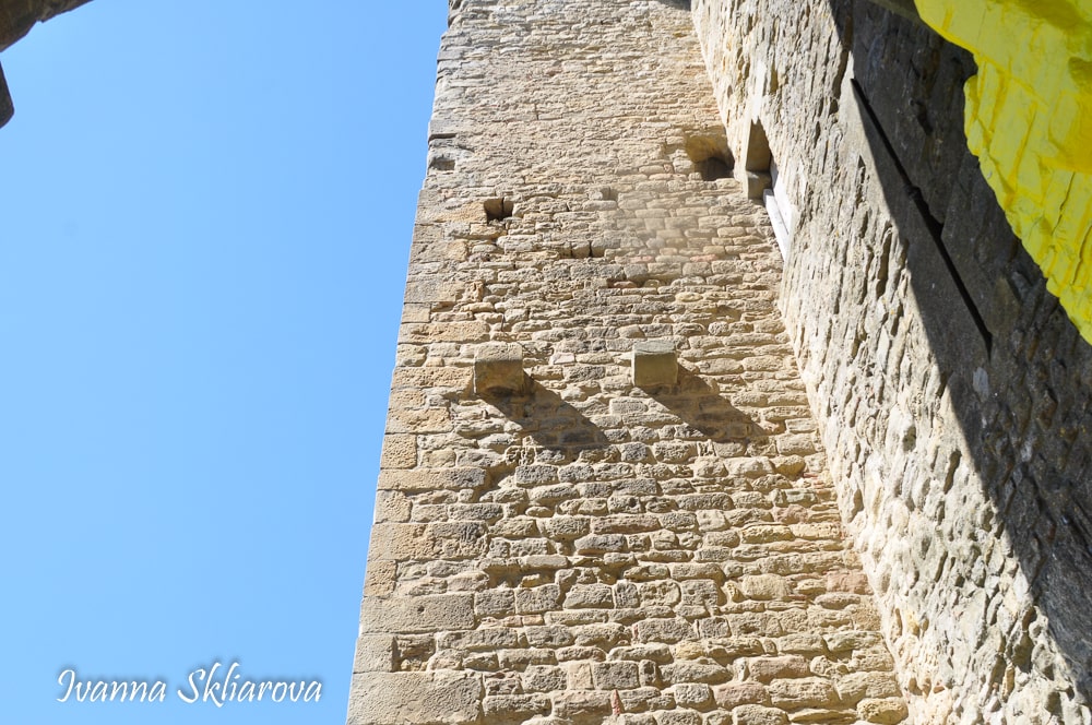 Цікаво, що вежі мають форму краплі і розділені на чотири поверхи. На першому і другому поверсі знаходяться склепінчасті круглі зали; на третьому - вихід на дозорну доріжку. З доріжки, покритої дощатим настилом, можна піднятися по сходах на четвертий поверх, де знаходиться зубчаста частина стін і дерев'яні галереї. Нижня частина веж розширюються на рівні землі. Зроблено це було для того, щоб камені, скинуті з дерев'яних галерей, відскакували б від похилих поверхонь і відлітали в натовп ворогів, що тіснилися біля них внизу.