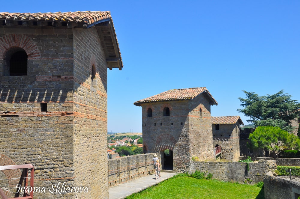 Для захисту від кочівників в III ст.н.е. поселення оточили стіною в якій були чотири в'їзди і тридцять веж галло-романського типу - тобто круглих ззовні, але квадратні зсередини, оскільки так вони виходили міцніше. Їх фундаменти були заповнені каменем до рівня дозорної доріжки стіни, що йшла по гребеню. На другому поверсі веж двоє дверей вели вверх, а три вікна дивилися назовні, причому і двері і вікна були увінчані цегляною склепінчастою аркою. Щоб забезпечити захист лучників, вікна, ймовірно, закривалися дерев'яними віконницями, подібно до гарматних портів на кораблях. Верхній поверх, куди підіймалися по приставних сходах, міг бути ізольований. І усе це скріплювалося міцним римським цементом, так що міцність цих стін виявилася такою, що багато з них збереглися.