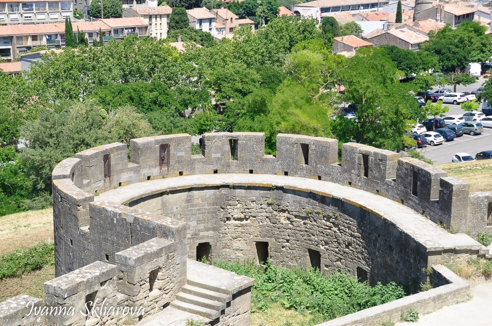 Серед зовнішніх веж виділяється вежа Трезо (Treseau), назва якої вказує на те, що вона використовувалася для зберігання королівської казни. З боку міста ця вежа зовсім плоска і виконана із ступінчастим шпіцом по фламандській моді, причому на додаток увінчана ще і двома сторожовими постами. Висота вежі 30 м, а товщина стін - 4! Ну, а розташовані поряд з нею Нарбонські ворота і зовсім чи не найпрекрасніший зразок середньовічних укріплених воріт.