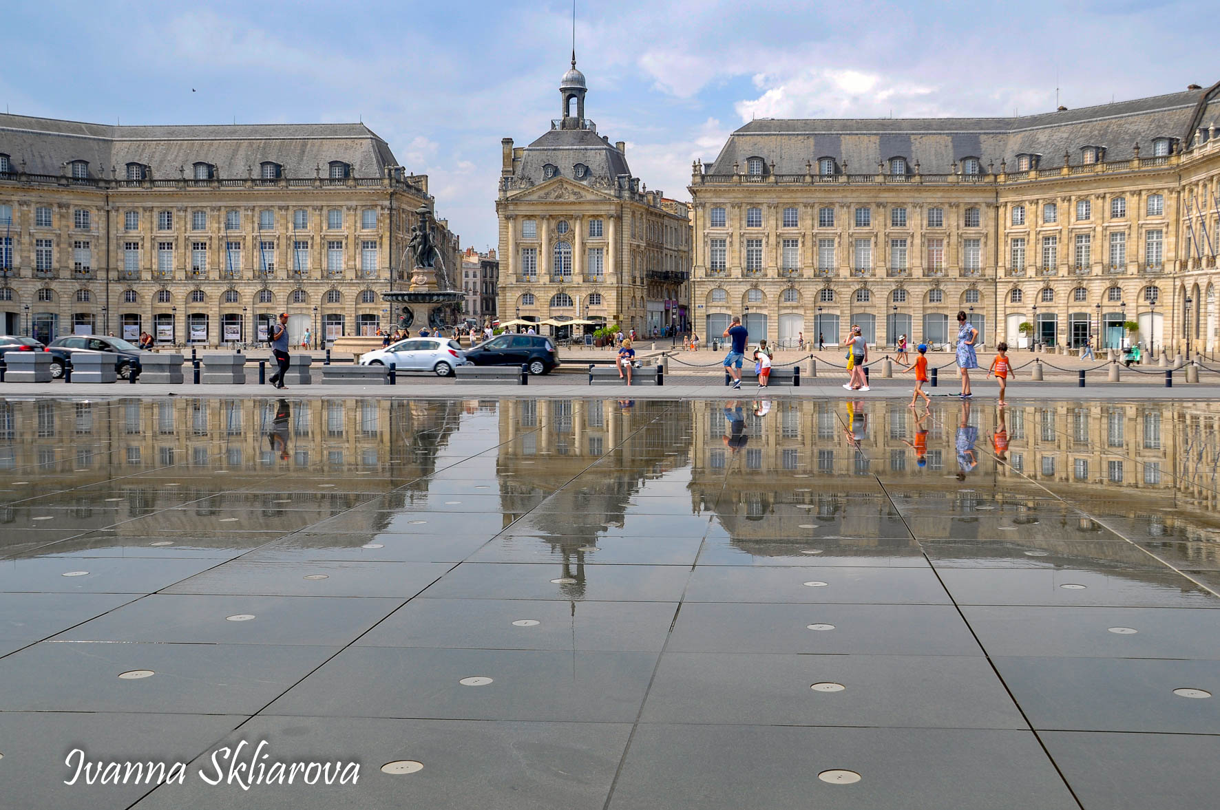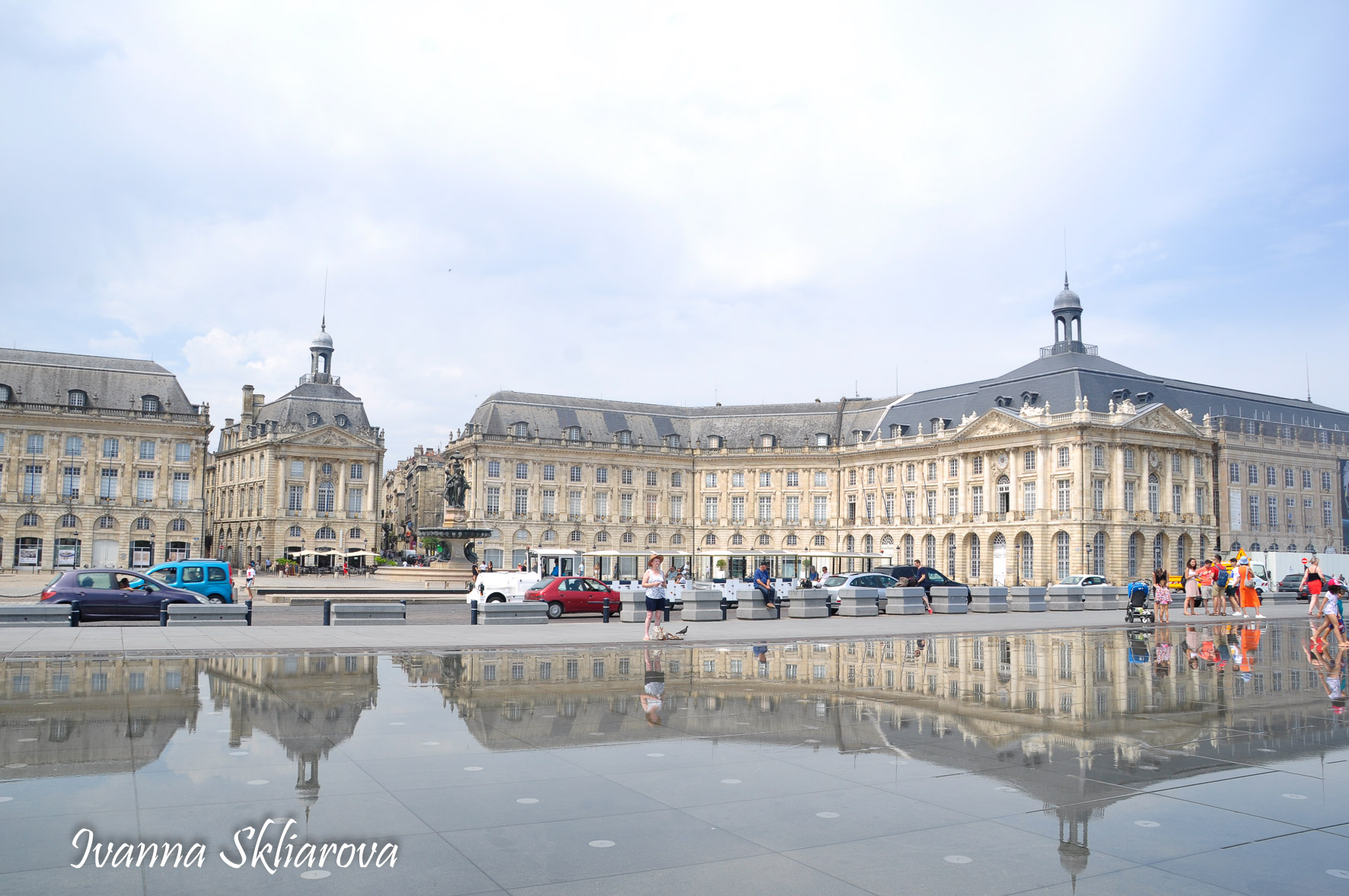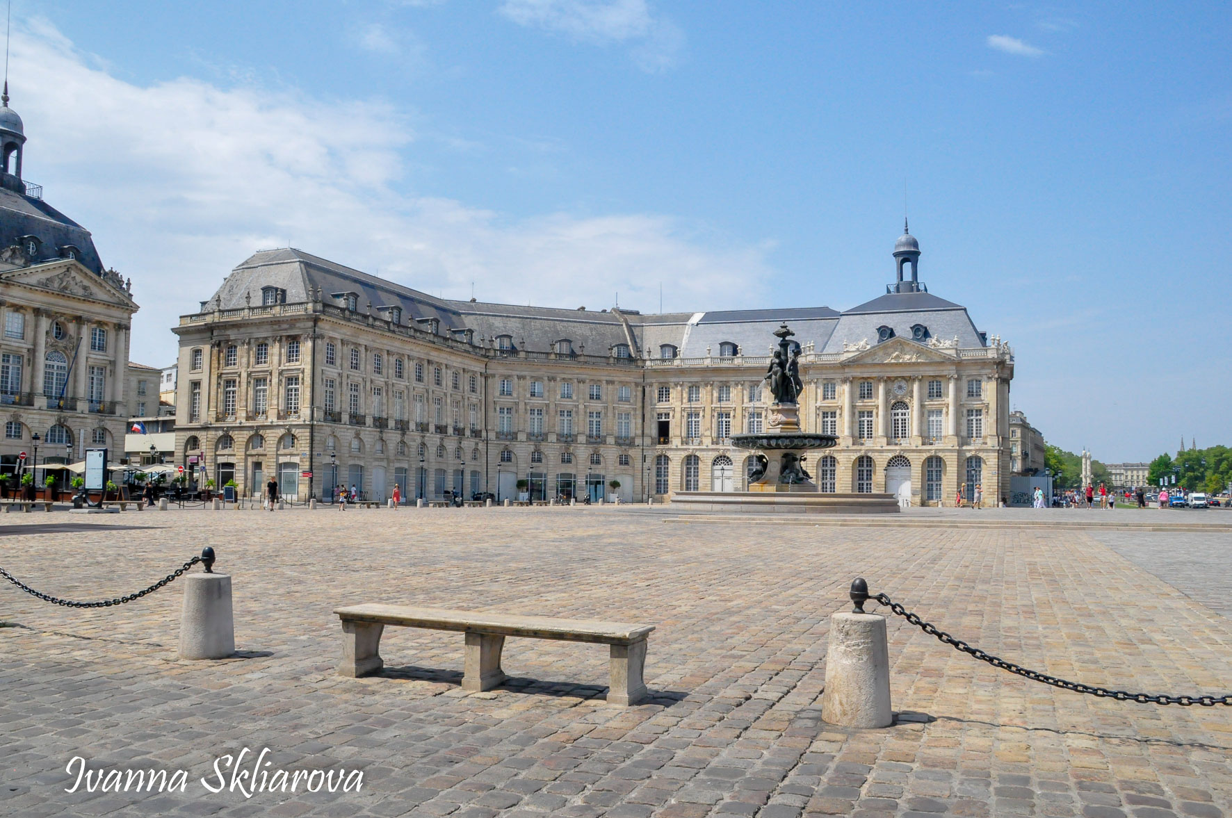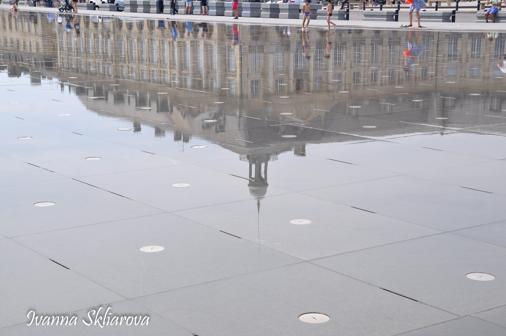 Площа de la Bourse (біржі) – один із символів Бордо. Це місце відігравало важливу роль у розвитку міста і торгівлі. Площа має красиву класичну архітектуру 18 століття. Фонтан трьох грацій знаходиться у центрі, який оточений старою фондовою біржею і музеєм митниці. З кінця липня 2006 року в Бордо з'явилося найбільше дзеркало води в світі (3450 м2). Воно виходить на площу Бурс, між набережною де-ла-Douane і набережної Людовіка XVIII, там розташований басейн, який змінює водяне дзеркало на туман. Феєрія фонтанів, створених Жаном-Максом Ллорка - це водяне дзеркало займає центральне місце і бездоганно вписується в старовинний пейзаж середньовічної площі. Басейн працює щодня з 10:00 до 22:00, а працює він за таким циклом: 3 хв. наповнюється водою, 15 хвилин відображається дзеркальна поверхня, 5-3 хв. напускається туман. Система паризького дизайнера Жана-Люка Лорка, дозволяє показувати один за іншим дзеркала (з 2 дюйма стоячої води на плиті з граніту), а також ефект туману до 2 метрів. Вода знаходиться під землею, в баку об'ємом 800 м3. Вона підіймається на поверхню за допомогою насосів, заповнює 100 ємкостей під плитою і виходить через стики по всій поверхні. Запрограмована комп'ютером, система електромагнітних клапанів дозволяє воді спуститися в резервуар, щоб знову набути потрібної температури. Вона може перетворюватись в газ і робити ефект туману з 900 сопел, які розташовані в центрі кожної плити.