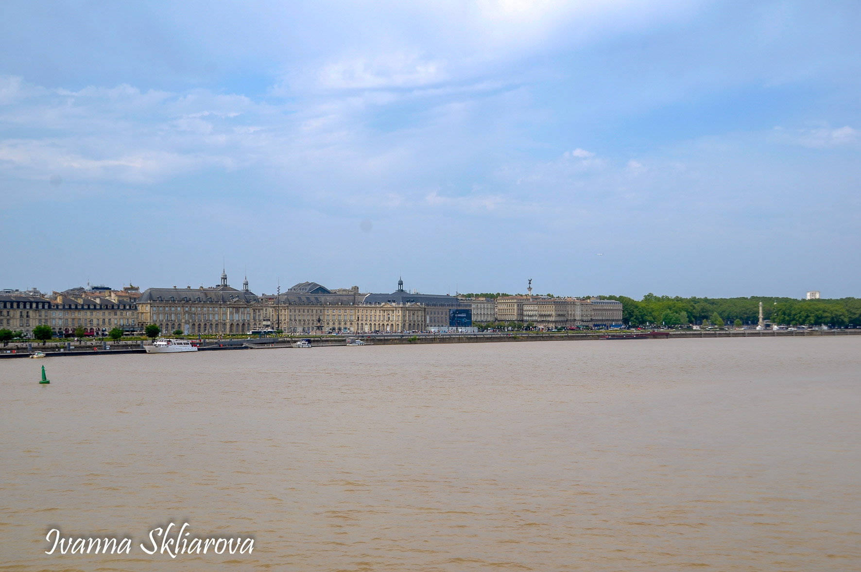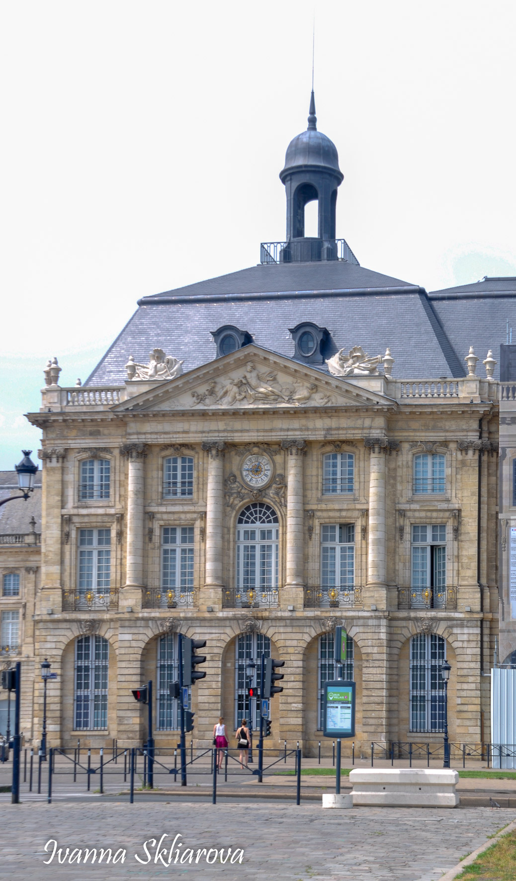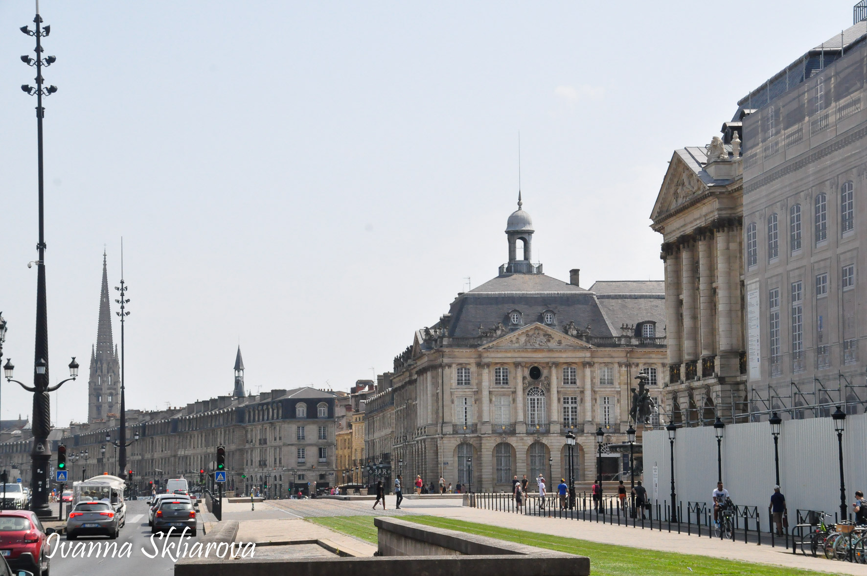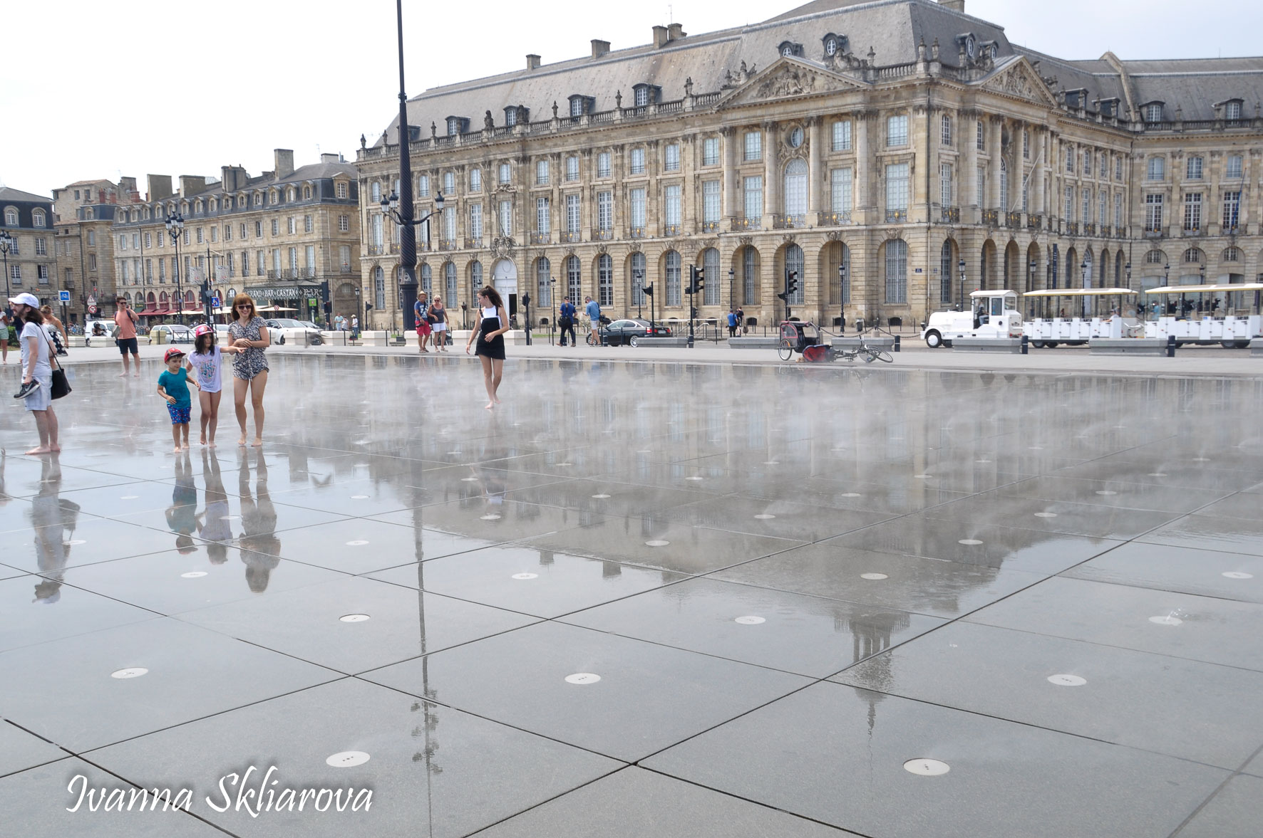 Площа de la Bourse (біржі) – один із символів Бордо. Це місце відігравало важливу роль у розвитку міста і торгівлі. Площа має красиву класичну архітектуру 18 століття. Фонтан трьох грацій знаходиться у центрі, який оточений старою фондовою біржею і музеєм митниці. З кінця липня 2006 року в Бордо з'явилося найбільше дзеркало води в світі (3450 м2). Воно виходить на площу Бурс, між набережною де-ла-Douane і набережної Людовіка XVIII, там розташований басейн, який змінює водяне дзеркало на туман. Феєрія фонтанів, створених Жаном-Максом Ллорка - це водяне дзеркало займає центральне місце і бездоганно вписується в старовинний пейзаж середньовічної площі. Басейн працює щодня з 10:00 до 22:00, а працює він за таким циклом: 3 хв. наповнюється водою, 15 хвилин відображається дзеркальна поверхня, 5-3 хв. напускається туман. Система паризького дизайнера Жана-Люка Лорка, дозволяє показувати один за іншим дзеркала (з 2 дюйма стоячої води на плиті з граніту), а також ефект туману до 2 метрів. Вода знаходиться під землею, в баку об'ємом 800 м3. Вона підіймається на поверхню за допомогою насосів, заповнює 100 ємкостей під плитою і виходить через стики по всій поверхні. Запрограмована комп'ютером, система електромагнітних клапанів дозволяє воді спуститися в резервуар, щоб знову набути потрібної температури. Вона може перетворюватись в газ і робити ефект туману з 900 сопел, які розташовані в центрі кожної плити.