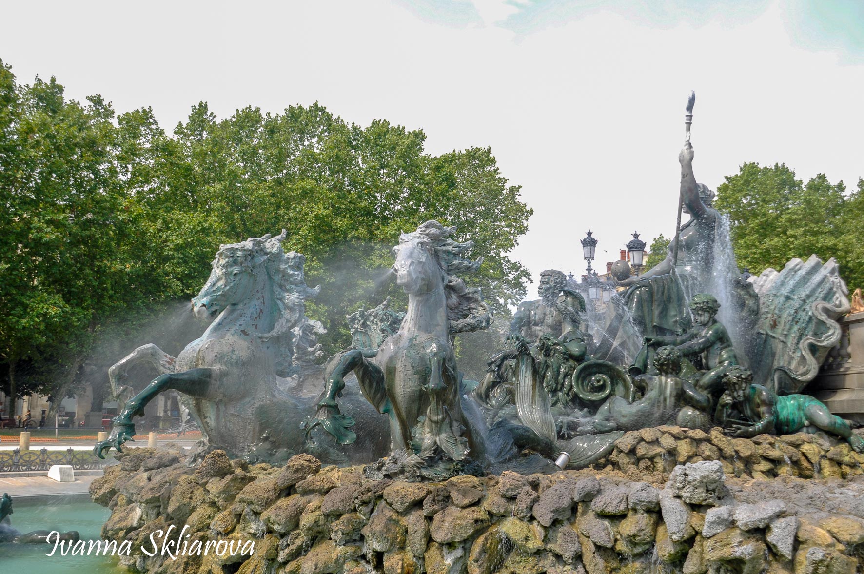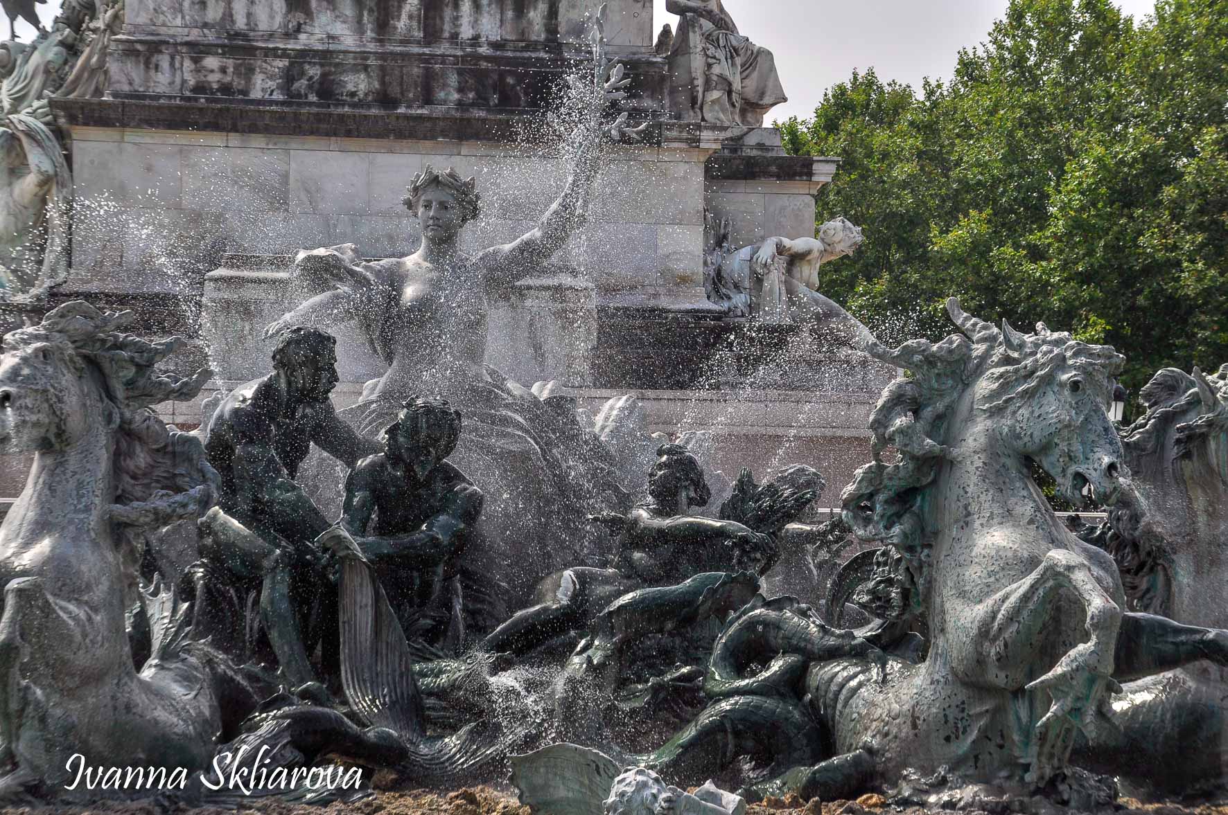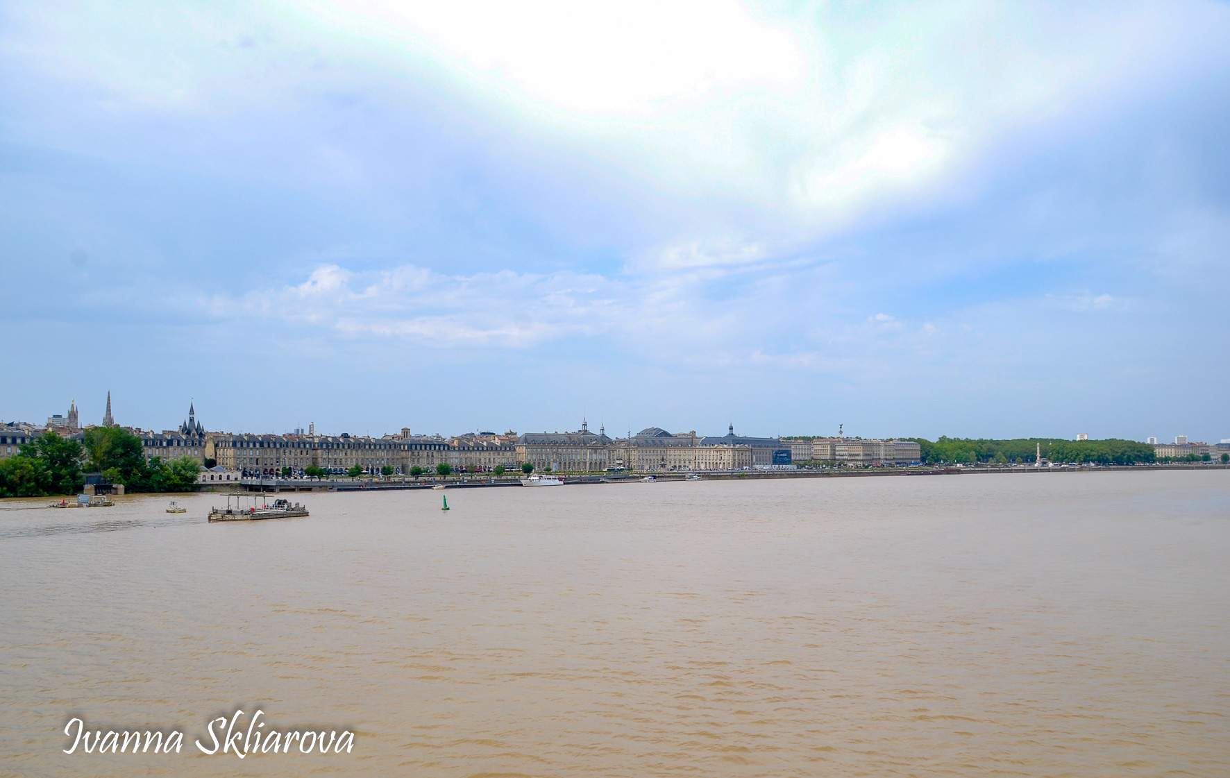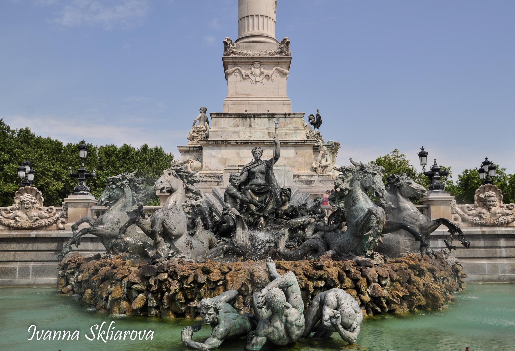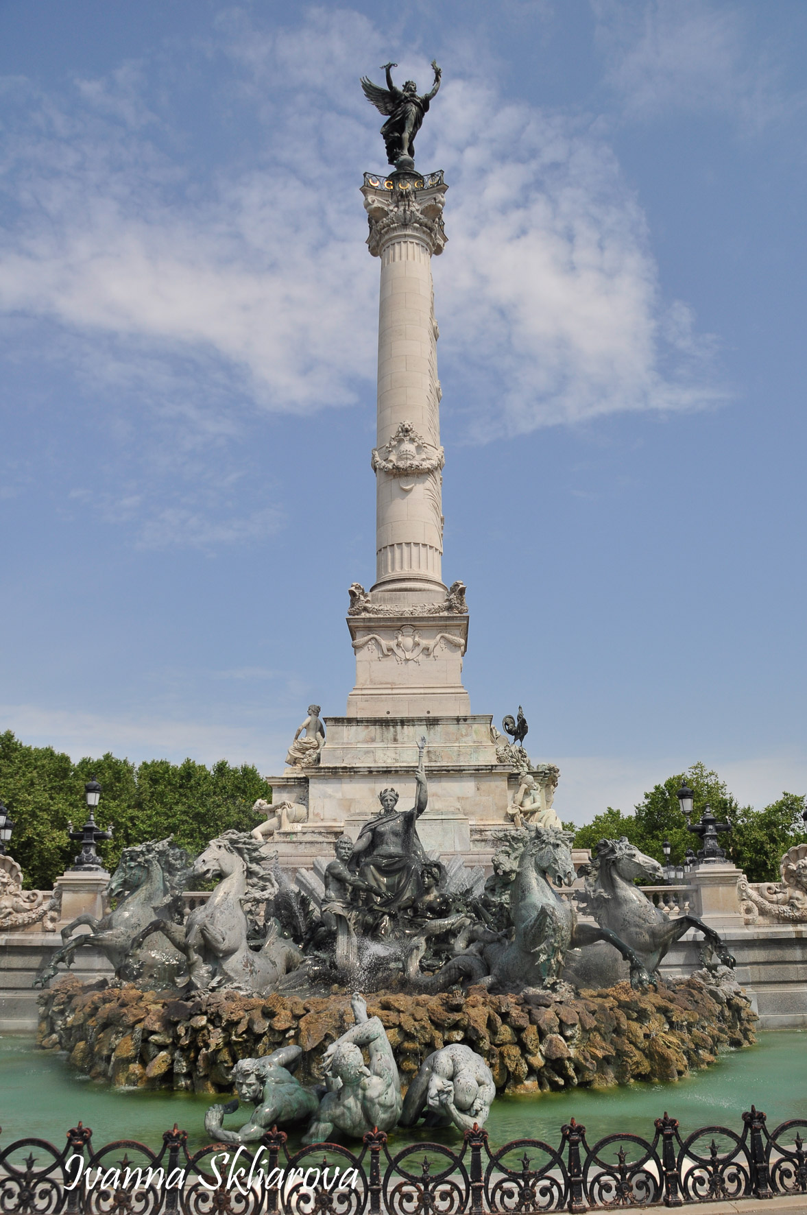 Площа de la Bourse (біржі) – один із символів Бордо. Це місце відігравало важливу роль у розвитку міста і торгівлі. Площа має красиву класичну архітектуру 18 століття. Фонтан трьох грацій знаходиться у центрі, який оточений старою фондовою біржею і музеєм митниці. З кінця липня 2006 року в Бордо з'явилося найбільше дзеркало води в світі (3450 м2). Воно виходить на площу Бурс, між набережною де-ла-Douane і набережної Людовіка XVIII, там розташований басейн, який змінює водяне дзеркало на туман. Феєрія фонтанів, створених Жаном-Максом Ллорка - це водяне дзеркало займає центральне місце і бездоганно вписується в старовинний пейзаж середньовічної площі. Басейн працює щодня з 10:00 до 22:00, а працює він за таким циклом: 3 хв. наповнюється водою, 15 хвилин відображається дзеркальна поверхня, 5-3 хв. напускається туман. Система паризького дизайнера Жана-Люка Лорка, дозволяє показувати один за іншим дзеркала (з 2 дюйма стоячої води на плиті з граніту), а також ефект туману до 2 метрів. Вода знаходиться під землею, в баку об'ємом 800 м3. Вона підіймається на поверхню за допомогою насосів, заповнює 100 ємкостей під плитою і виходить через стики по всій поверхні. Запрограмована комп'ютером, система електромагнітних клапанів дозволяє воді спуститися в резервуар, щоб знову набути потрібної температури. Вона може перетворюватись в газ і робити ефект туману з 900 сопел, які розташовані в центрі кожної плити.